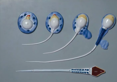 This model shows the process of spermatogenesis from spermatid to mature spermatozoon. Magnified approximately 10,000 times.
