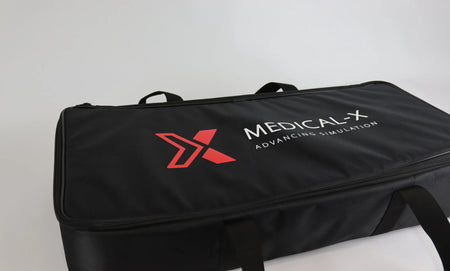 The set includes: silicone leg, application bottle, tubes for blood flow (3x), medical-x stand, 1-liter simulated blood and transportation bag.